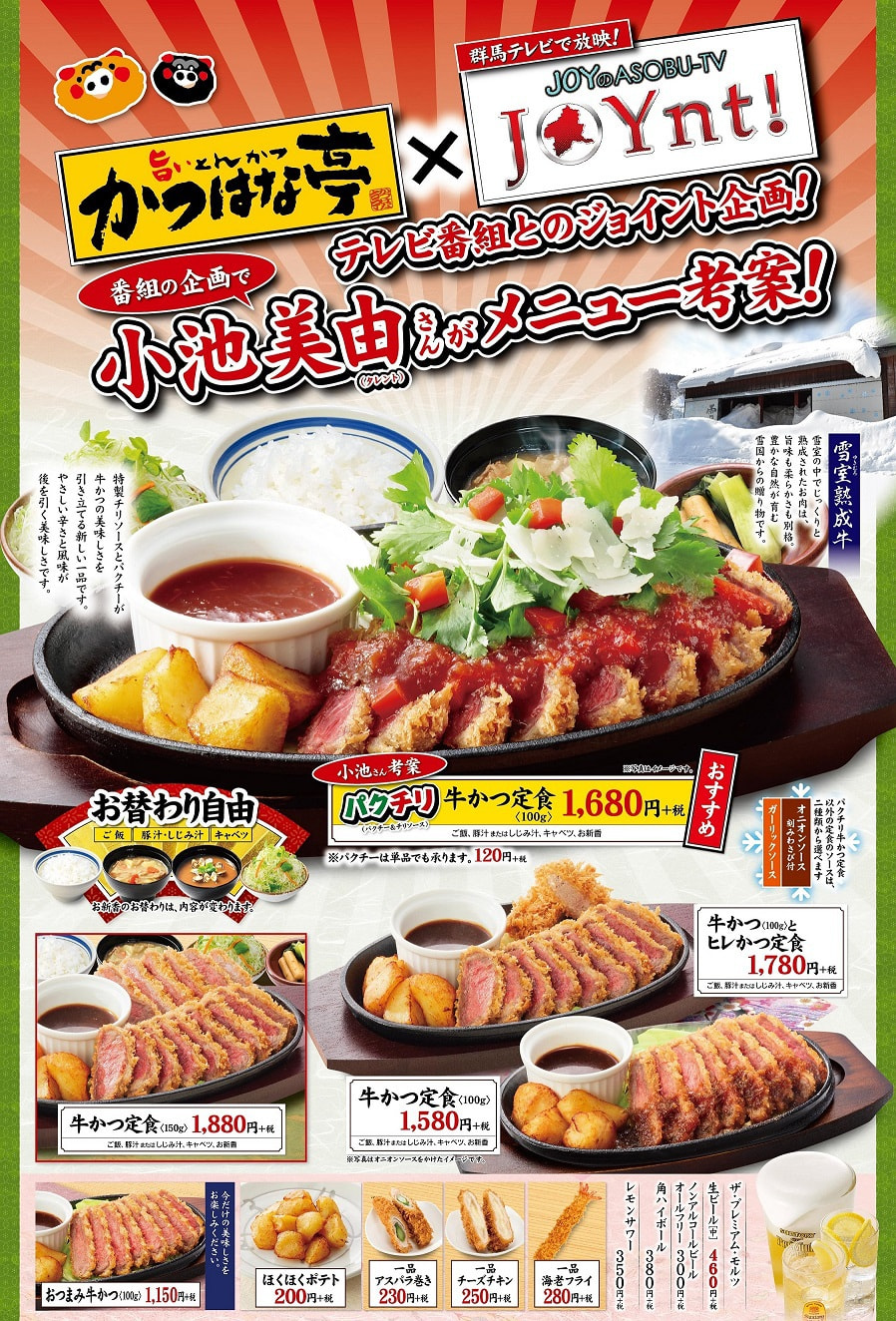 かつはな亭では、小池美由がテレビ番組(群馬テレビJOYのASOBU-TV JOYnt!)の企画で考案したパクチリ牛かつ定食が仲間入り。雪室の中でじっくりと熟成されたお肉を、様々な味付けでお召し上がりください。